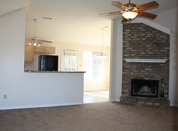 Move in ready home has been completely renovated with all new flooring, fresh paint, upgraded light fixtures, new kitchen countertop and 2in blinds throughout. Kitchen features a built in microwave, a stove, a dishwasher, a refrigerator and a breakfast bar. New kitchen floor. Lots of light. Greatroom features all new carpet, fresh paint, upgraded ceiling fan, a corner fireplace and prewired surround sound. Master bedroom has its own full bath with linen closet, new floor, fresh paint and upgraded ceiling fan. Washer and dryer. Backyard has been fully fenced in. There is a storage building and a patio.