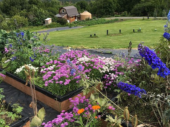 Thoughtfully designed one-of-a-kind property. Warm and inviting Hand Picked Douglas Fir Timber Frame home perfectly positioned on 3 ac. to take full advantage of 180-degree Kachemak Bay views. Over 7,500 Peonies, 3 High tunnels and many gardens throughout. Attached Mother-in-law unit and 2 additional Rental Units. Make this a home or venue to host beautiful events to celebrate life's best moments.Letter from Dr Hahns Family Estate: This house and the accompanying gardens are not typical, it was all designed and constructed with care by my father, a true Alaskan "Renaissance Man" who was born in Point Barrow and grew up in Nome. The story of the house begins in Washington State, in the early 90's. Our family farm in the Snoqualmie valley experienced a powerful windstorm which knocked down several enormous second-growth Douglas Fir trees. There are sawmills in Western Washington that are still equipped to handle the giant trees that used to populate the region, we enlisted Davidson Saw Mill to haul out and cut the fallen trees into the beams that now make up this house. My father bought a 1920's vintage wood planer from the Port Townsend shipyard, hauled it back to our farm in his pickup, just to be able to plane down the beams himself to fit the blueprints. Unable to complete the house in King county, my father hauled the wood all the way to Homer, where it sat in storage for 15 years, awaiting the perfect location. Once he found the Fernwood lot, construction preparation began. Everyone in the family was involved, one way or another in the construction, from clearing the lot to raising the timberframe, painting the walls and helping plant the gardens. My father was a passionate gardener, and every flower he planted was carefully selected. The contrast of colors and types of plants were very important, tulips, daffodils, delphiniums, forget-me-nots, poppies, lilacs, mountain ash and the 7500 peonies decorating every corner of the property. I hope the next caretakers of this house can appreciate how much love was put into it, how much passion, and appreciate the details and uniqueness. -William Hahn Details from the family regarding property: Solar Power System: 27 Solarworld 295 Watt panels. 7,965 watts total. Sunnyboy grid-tied inverter. No batteries. Triple pane low-E windows throughout. 5 star plus energy rating Main house is constructed with 12" thick foam SIPS (structural insulated panels) on top of Douglas Fir timberframe installed by Alaska Timberframe. Roof is standing seam metal, cedar shingle siding. Quad-lock foundation on concrete slab. Slate floors on main floor over gypcrete with heating loops installed but not hooked up. Upper two floors have shower and toilet, main floor has toilet only. Kitchen features: Custom cabinetry, double electric range, microwave, induction cooktop, dishwasher, stainless sink in island with bar, double fridge/freezer. Twin 5000 gallon water tanks with rainwater collection system. All-wood spiral staircases, Douglas fir solid wood flooring on upper two floors, ceiling fan. Large basement with shower and toilet, utility room with electric water heater, root cellar/peony chiller with heat pump chiller system. Attached solarium greenhouse with storage room behind. Large solid-floor deck over dry storage area outside of basement. Mother-in-law apartment is unfinished, featuring a loft and slate floors and high-quality countertop, induction cooktop, slate shower. 2-car Garage has in-floor heating loops installed but not hooked up. 2x6 framing with 2" rigid foam on exterior, ¾ inch rigid foam on interior. North side rental cabin features a yurt integrated into the structure, toilet and shower, induction cooktop, microwave/convection oven, wood fireplace, toyo oil heat, and baseboard electric heat. 550 gallon water tank in basement. Separately metered electricity. Smaller rental cabin has propane heat, shower and toilet, twin 300 gallon tanks, and small yurt with running water and electricity. Three high-tunnel greenhouses feature drip irrigation system, 500 gallon water tank, nearby creek for filling tank. Raised beds, hose system, automatic louvers and ventilation fans. Extensive aesthetic gardens and raised beds throughout the property. Peony fields with irrigation system, chicken coop, pond.