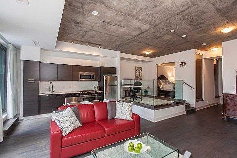 Welcome To The Heart Of King W! This Functional, Unique, And Spacious One + Den Is The Only Unit In The Building Like This! Enjoy Your Peaceful Private Terrace Overlooking Courtyard - Your Own Oasis. Modern Finishes, Exposed Concrete 10Ft Ceilings, And Floor To Ceiling Windows. Den Large Enough For Office/Second Living Space. Top Tier Amenities In A High End Building. Premium Location Steps To Grocery Stores, Gyms, Ttc, Parks, Restaurants, Bars, Shops + More!