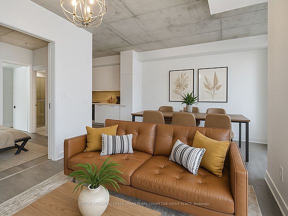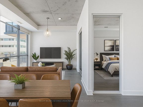 Floor to ceiling windowsModern galley kitchenFull sized appliancesGas stoveFantastic living spaceDining areaLarge bedroom