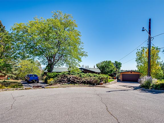 This stunning two-story home is perfectly situated at the end of a cul-de-sac on a fully fenced 1.2-acre canyon lot. The property boasts an oversized 1,000-square-foot, six-car garage/shop and convenient RV parking with a second driveway. As you step inside, you're drawn to the sunken Living room highlighted by its vaulted beamed ceilings, creating an expansive, airy feel. A wall of towering cathedral-style windows floods the room with natural light, offering stunning, panoramic views of the surrounding mountains and canyon. At the heart of the living room is a large, bricked wood-burning fireplace. Adjacent is the dining area, maintaining the home's open layout. A Beautifully designed galley-style space that combines function and style features rich wood cabinets, luxurious marble countertops, stainless steel Jenn-Air appliances, and a peninsula with bar seating. A quaint breakfast nook leads to the side patio and garage. A spacious primary en-suite boasts a wood-burning fireplace, an organized walk-in closet, and sliders that open to a wrap-around deck, where you can enjoy stunning views while sipping your morning coffee. The updated primary bathroom features a double sink vanity and a tiled walk-in shower. Also on this floor is a guest bedroom and a full guest bath with a sunken tub. The finished basement offers a comfortable family room with a wood-burning fireplace and access to a covered deck with an included spa. Two guest bedrooms, one with a walk-in closet, and a guest bathroom with a tiled walk-in shower. A laundry closet is also conveniently located downstairs. The beautifully landscaped backyard includes a variety of fruit trees, a lush grassy lawn, and a decked-over swimming pool that could be uncovered and new pool equipment added. With direct access to the Bayo bench trail system from the backyard, this home is perfect for outdoor enthusiasts. Equipped with a mini-split AC/heat system, ensures comfort year-round. Come and fall in love with this one-of-a-kind property!