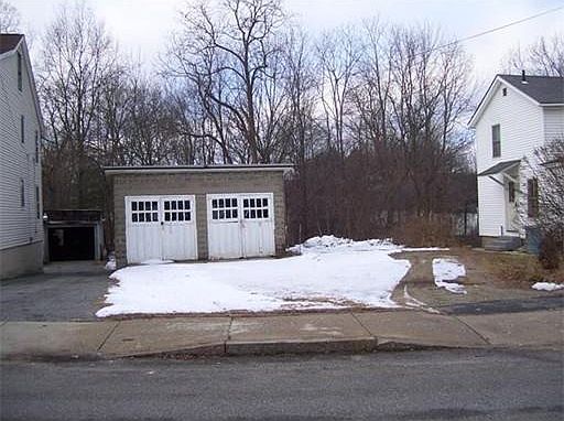 This house is sturdy and sits on a large, nice corner lot which is bordered on one side by a small stream. Nice front porch to sit and listen to the soothing sound of the stream. First floor offers bedroom and 1/4 bath, as well as an eat-in kitchen with a pantry/laundry, large living room. Two bedrooms and full bath with claw-foot tub on second floor. Two-car detached well-built stone garage with 10-years-young roof. Upgraded electric panel. Interior is dated and in need of some cosmetics, but the price is right! Come take a look.