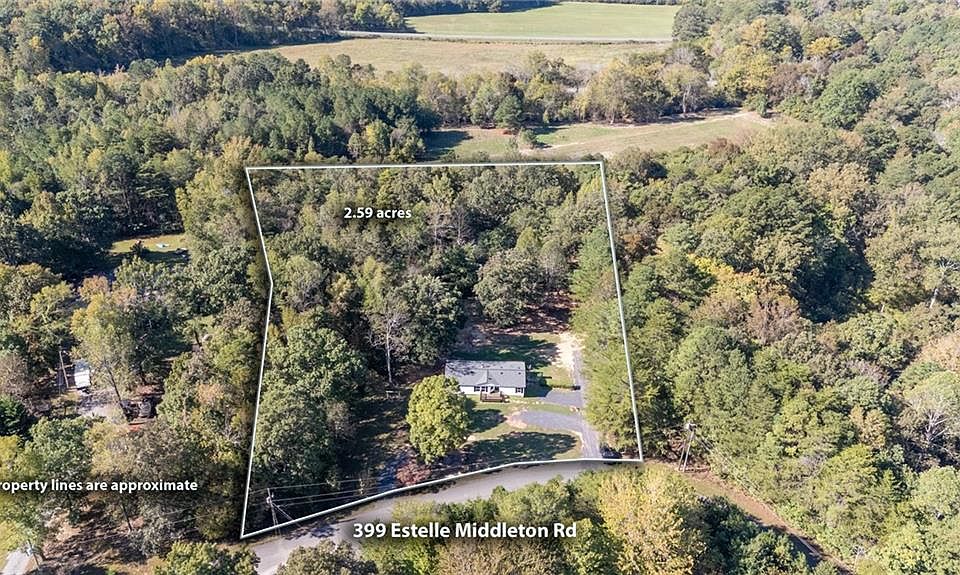Enjoy peaceful country living in this beautifully updated 3-bedroom, 2-bath home set on 2.59± wooded acres. Move-in ready and freshly renovated throughout, this property offers modern updates and quiet surroundings just minutes from town. Inside, you’ll find all new flooring—luxury vinyl plank, laminate and carpet—fresh interior paint, (including ceilings) new lighting, and two fully updated bathrooms. The spacious living area features large windows for natural light and a charming stone fireplace. The kitchen includes beautifully refurbished countertops, ample cabinetry, stainless steel appliances, and a brand-new stove and microwave. The primary suite is spacious and inviting, offering a large walk-in closet and a fully renovated bath with double vanity, separate shower, and soaking tub—a truly roomy and relaxing retreat. Two additional bedrooms share a stylish new hall bath, and a dedicated laundry area adds convenience. Step outside to enjoy the brand new large back deck overlooking your private wooded acreage—perfect for relaxing or entertaining. Down a wooded pathway with new gravel, at the back of the property sits a really cool barn, ideal for storage, hobbies, gatherings, or even a future she shed. A perfect blend of comfort, space, and modern updates—welcome home to 399 Estelle Middleton Road.