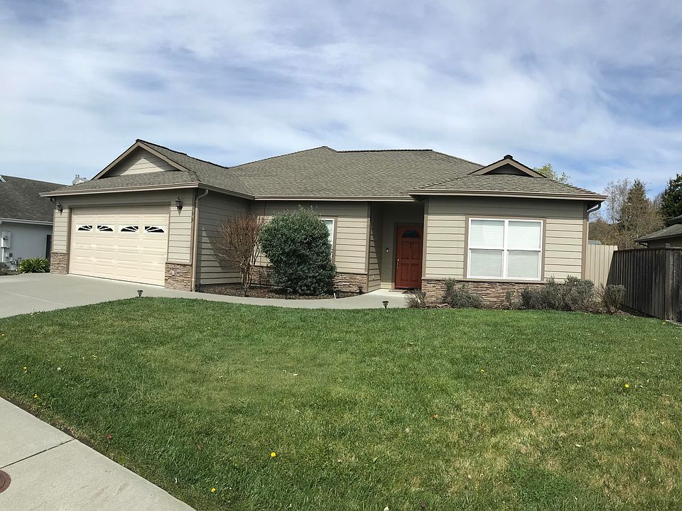 Large family home with a great room/open floor plan. Formal Dining room or Den with coved ceilings. Pre-finished hard wood floors in the beautiful cheery cabinet kitchen with Corian counter tops, under cabinet lighting and stainless appliances. Master suite on one end of the house with a soaking tub, separate walk-in shower and a large walk in closet. Other end of the house has two more bedrooms and a hall bath with glass doors and Corian counters. Backyard backs up to a neighbor with a very large parcel and a big red barn, providing a lot of privacy for backyard entertaining. Covered back patio with a Sunsetter awning gives you year round use for family gatherings or BBQ's. Finished garage with on-demand water heater, laundry room in house located just outside the garage entry.