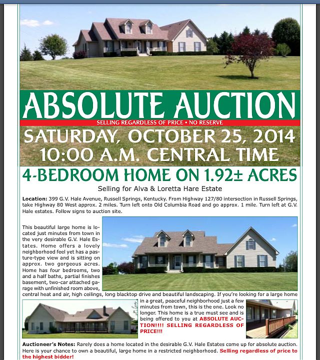 ABSOLUTE AUCTION !!! SATURDAY OCTOBER 25TH @ 10 A.M. CST!!! SELLING WITH NO RESERVE TO THE HIGHEST BIDDER!!! This beautiful large home is located just minutes from town in the very desirable G.V. Hale Estates. Home offers a lovely neighborhood feel yet has a pasture type view and is setting on 2 gorgeous acres m/l. Home offers 4 bedrooms with extra large master, 2 1/2 bath, partial finished basement, 2 car attached garage with unfinished bonus room above, central heat/air, high ceilings, long black-top drive, and beautiful landscaping. If your looking for a large home in a great peaceful neighborhood yet just a few short minutes from town this is it. Look no longer. This home is a true must see and is being offered at a price to move. You will not find many homes on the market this large that's being offered at this price. Give us a call today to set up a showing. Compared to other listings on the market this home wont last long. TERMS- 10 % DOWN DAY OF AUCTION WITH BALANCE ON OF BEFORE 30 DAYS. NO BUYERS PREMIUM!!! NO RESERVE!!! ANY ANNOUNCEMENT MADE DAY OF AUCTION TAKE PRECEDENCE OVER ANY PREVIOUS ADVERTISING!!! CALL JETER COFFEY PRIN. AUCTIONEER AT 270-866-9500 FOR MORE INFO. BROKER- GLEN MCQUEARY DOWN TO EARTH REALTY & AUCTION 270-866-9500 207 EAST STEVE WARINER DR. RUSSELL SPRINGS, KY 42642
