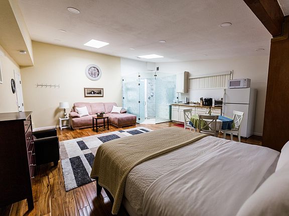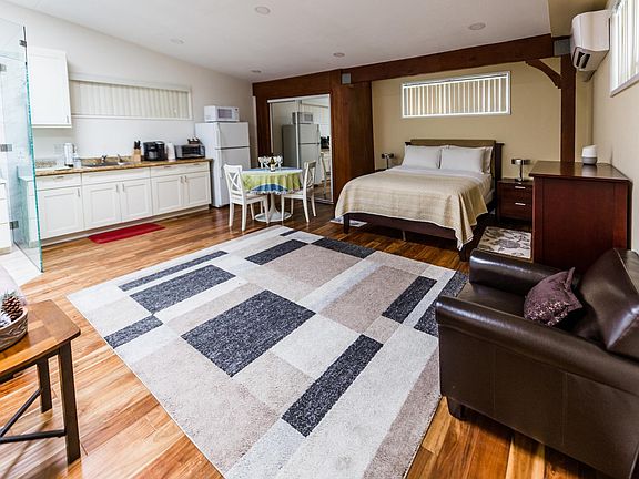 The unit is fully furnished and has a comfortable queen-sized bed with a memory foam mattress, a dresser, and a chair;a full bathroom with standing shower.