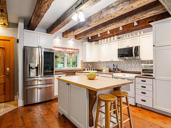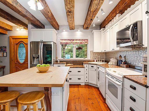 Nestled on 10.04 picturesque acres, discover this gorgeous 3 bed, 3 bath Essex Victorian. Built in 1997, this unique residence seamlessly integrates old-home features with contemporary amenities. From the lovely front porch, step inside to find wide plank hemlock floors & hand-hewn beams gracing the open 1st level. The farmhouse kitchen is a chef's delight with granite countertops, maple island, new fridge (2023), & a built-in beverage center. Enjoy cozy evenings by the Hearthstone soapstone wood stove in the inviting living room, or retreat to the den with access to the back patio made from bricks sourced from Fort Ethan Allen. A screened-in porch off the mudroom offers a tranquil spot to unwind. The 1st floor also boasts a renovated 3/4 bath completed in 2021, and access to the partially finished basement for additional rec and storage space. Upstairs, the primary bedroom features a walk-in closet, lofted storage space, and a luxurious ensuite 3/4 bathroom renovated in 2021 with dual marble vanities and a rainfall showerhead. Two additional bedrooms, laundry, and another full bath with a charming clawfoot tub complete the 2nd floor. Outside, the landscaped lot with perennial gardens provides ample space for outdoor activities, complemented by exterior sheds for storage. Located near the Essex Country Club and just minutes from the Essex Experience for shopping, dining, & entertainment, this home offers a perfect blend of privacy and convenience in a serene Vermont setting.