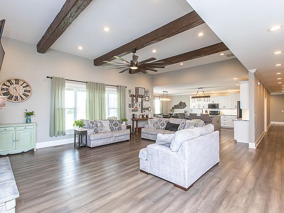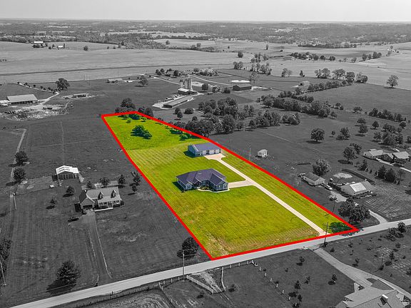 A stunning setting and luxurious finishes impress at this immaculate custom built executive ranch home on 5 acres! Offering 6 bedrooms and 3 full baths w/ 3200+sf of fully ADA accessible living space, this central KY property also includes a 3000+sf climate controlled detached garage! Built in 2019, a dazzling open concept living area welcomes w/ 12ft ceilings, gorgeous hardwood flooring and a lovely gas fireplace. The bright, pristine kitchen/dining area boasts granite countertops, premiere stainless appliances, island seating and a large walk-in pantry. All bedrooms are excellent size, w/ one including home office built-ins/wiring, and the sizable primary suite featuring an oversized walk-in closet, 3-system tile shower, double vanity and soaker tub! Beautiful granite is featured within all bathrooms and oversized utility room. Perfect for a home business or additional living area/storage is the 9-car capacity detached garage, presenting a full bath, vast flex room, (4) 10ft garage doors, 400 amp service and independent systems! Flat acreage allows for horses, and location under 3 miles from Herrington Lake and 45 min from Lexington is ideal! Call today!