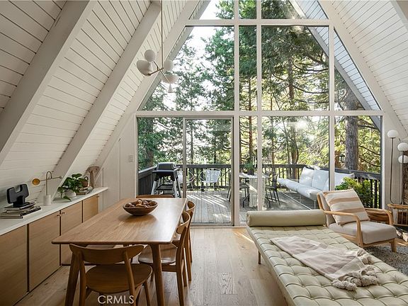 The A-frame You've Been Waiting For! Discover your perfect mountain getaway in this fully renovated A-frame nestled among the trees of Lake Arrowhead. With modern updates and mountain charm, this turnkey home offers effortless living in an ideal location. Inside you'll find an inviting open living space flooded with natural light, accentuated by floor-to-ceiling feature windows that frame picturesque views of the surrounding forest. Enjoy cozy nights by the fireplace or step outside to one of three tranquil decks to soak in the serene surroundings. The main level features two spacious bedrooms, a modern kitchen, and a bathroom for convenience, making entertaining a breeze. Upstairs, a primary suite awaits, complete with modern amenities and a loft area offering stunning views of the living space below. Downstairs, a versatile lower level provides space for entertaining or relaxation, complete with a second fireplace to keep you cozy on chilly evenings. It also features an additional bathroom and a dedicated laundry room space for added convenience. Step out to the concrete patio, where a relaxing spa awaits—a perfect spot to unwind and soak in the mountain atmosphere all year long. Plus, the fenced backyard offers ample space for your furry friends to roam freely. In addition, this home offers modern conveniences including a recently installed HVAC system with air conditioning, insuring comfort for all seasons. With excellent rental potential and lake rights, this truly is mountain living at its finest.