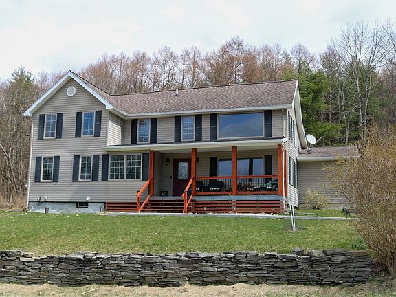 This charming farmhouse adjoins 7,600 Acre Danby State Forest. Inside, numerous improvements have been made to enhance both functionality and aesthetics, including new flooring on the main level, a Hearthstone wood stove from Ithaca Stove Works, a poured back patio, and a partially replaced roof. Additionally, the pressure tank in the boiler was replaced in 2023, ensuring efficient heating throughout the colder months. Open floor plan seamlessly connects the living room, cozy family room adorned with a wood stove and cathedral ceilings, and the spacious renovated kitchen with a custom-built central island. Newer stainless steel appliances. High-speed internet is available. Outside, the nearly 3-acre property offers many recreational opportunities, from lounging on the deck to taking a refreshing dip in the above-ground pool or fishing in the stocked pond.