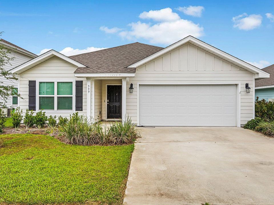 Just built in 2020! This gorgeous 3 bedroom, 2 bath home is nestled on a quiet cul de sac street in a new community within the highly coveted Hammock Bay, which features innumerable, top-notch amenities, including but not limited to multiple resort-quality pools, dog park, walking trails, fitness center, club house, tennis & basketball courts, General Store, playgrounds, Bay-front pavilion and dock, RV/Boat storage (separate fee), & more! This lovely home boasts gorgeous flooring and neutral paint throughout and a split, open floorplan, complete with a spacious living room, formal dining area, and plenty of cabinet/counter space in the kitchen (complete with stainless appliances, including a flat cooktop stove & side-by-side refrigerator), island/ breakfast bar, and walk-in pantry. The master bedroom has its own en suite with a double vanity, walk-in shower, garden tub, and separate toilet room, as well as a walk-in closet. Both guest bedrooms are nicely sized and share a full bath, as well. There is a laundry room, and there is a covered patio that we screened in overlooking the backyard.
