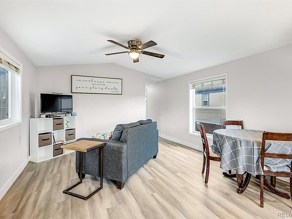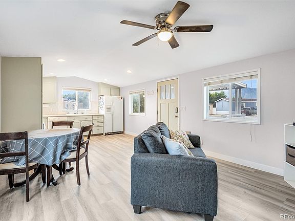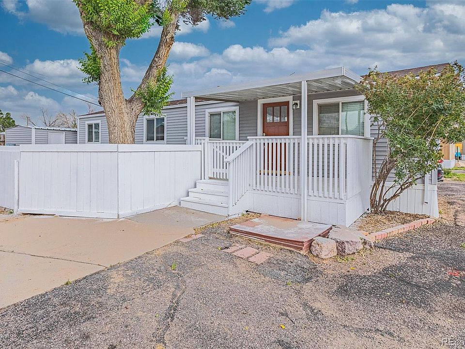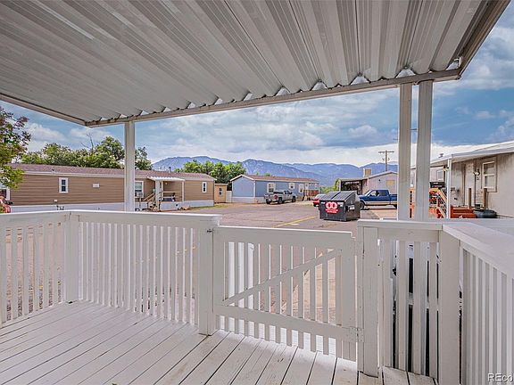 Beautifuly updated 2 bedroom, 1 bath manufactured home in the private established Elm Crest Mobile Home Community. All new vinyl siding and upgraded front door. Covered front deck to enjoy the Colorado sunshine and fabulous mountain views. Light and bright open floor plan with spacious living areas great for entertaining. All new drywall and interior doors. Newer Luxury vinyl plank flooring throughout the hallway, Bathroom, Laundry Area, Kitchen, and Dining Area. Neutral carpet in the Primary Bedroom and Office (2nd Bedroom). Window blinds throughout. Central air and heat for year round comfort. The front entry leads you into a large Living/Dining Room that includes lots of natural subnlight and a lighted ceiling fan. Custom laid-out Kitchen with modern shaker-style cabinets and quartz countertops. Abundant cabinets and counterspace for storage and easy food preparation. Appliances include a gas range oven, dishwasher, microwave, and side by side refrigerator. The Primary Bedroom features carpet and mirrored wardrobe doors. Updated full bath with vanity, mirror, and new tub/shower with tile surround. The 2nd Bedroom (currently an office) has been converted to an office with built-ins (no closet) and a drop down murphy bed system that stays (mattress not included). The Laundry Area includes the washer and dryer. Low maintenance lot with newer fence and storage shed for tools and toys. Off street parking. Pet friendly with restrictions. Close to shopping and restaurants with easy access to the Fountain Creek Trail System for hiking and biking. Don't miss the opportunity to make this delightful home yours!