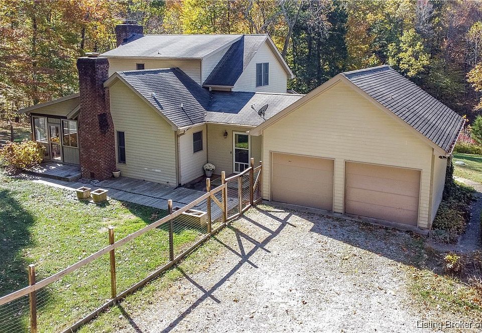 Nestled on 21+ private wooded acres, this custom-built residence offers a blend of serenity, functionality & modern comfort. A meandering driveway crosses over a babbling creek fed by natural springs & leads to a thoughtfully designed home which includes geothermal system for optimum efficiency. Sunsets are breathtaking from the expansive covered front porch, a fitting prelude to the inviting interior accented by vaulted ceilings & gleaming hardwood flooring throughout. The family room offers brick hearth fireplace & access to a stunning 3-seasons room w/vaulted ceiling & full glass enclosure. The heart of the home is the open eat-in kitchen featuring a second brick fireplace with an option for open-fire cooking & access to the 3-seasons room. Custom cabinetry, granite countertops, center island, and full appliance package make this kitchen both beautiful & functional. Just off the kitchen, you’ll find a convenient mudroom & laundry area. The main-level primary suite is a private retreat, boasting walk-in closet & spa-like bathroom finished in granite & tile. A guest powder room completes this level. Upstairs, you’ll find two generous bedrooms, each with walk-in closets. One bedroom enjoys direct access to a full bathroom, while the other connects via the hallway. A walkout lower level offers cozy family room with built-in bookcase & wood-burning stove. Additional features include 2-car garage, fenced backyard, multi-purpose barn, green house & gardening area & so much more!