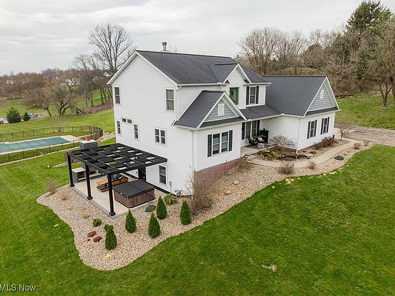 Nestled on over 5 acres, this exquisite 6/7bedroom, five bathroom residence offers an unparalleled blend of luxury and comfort. As you enter the main level, you're greeted by a gourmet kitchen with Corian counter tops, custom maple cabinets and two large pantries. The kitchen seamlessly flows into a spacious living room which has large windows that allow the natural light to flood the room along with a striking stone gas fireplace. The main floor has dedicated office with a closet perfect for remote work, study or even a 7th bedroom. The main floor also has a lavish primary suite featuring a generous ensuite bath with soaker tub, separate shower, double sinks and walk-in closet. Head up to the second floor, you'll find four well-appointed bedrooms with ample closet space, two pristine full bathrooms, and a conveniently located laundry room, ensuring ease of living. The fully finished basement serves as an entertainment haven with a cozy family room, a stylish wet bar, an additional bedroom, and a full bathroom. This level's walk-out design leads directly to an outdoor oasis, complete with a charming pergola, an inviting patio, a rejuvenating hot tub, and a custom-built outdoor fireplace, ideal for gatherings in any season. The property's exterior is equally impressive, featuring a pristine in-ground saltwater swimming pool that promises endless summer enjoyment. A spacious two-car garage provides ample storage and parking solutions. With its expansive acreage and thoughtfully designed living spaces, this home offers a perfect retreat from the hustle and bustle, while still providing all the modern amenities for a sophisticated lifestyle.