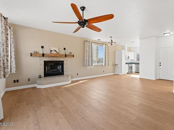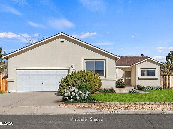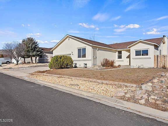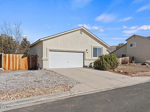 Beautiful single-level home on a quiet cul-de-sac in the White Lake Ranch community of Cold Springs. This 1,458 SF home features open living space with mountain views and abundant natural light. Freshly painted interior with new LVP and hardwood flooring throughout, recessed kitchen lighting, and newer ceiling fans. Custom rustic/farmhouse light fixtures in both bathrooms. Large front bedroom with hardwood floors and a separate entry is ideal for a multi-gen suite. Den/formal dining room could easily convert to a fourth bedroom. Wood-burning fireplace is plumbed for gas. Laundry room includes gas and electric dryer hookups. Bring your toys—this charming home sits on a spacious 1/3-acre lot with gated RV parking. Full sprinklers and a 7-zone irrigation system. Mature landscaping includes blue spruce, mugo pine, and flowering pear trees. Private backyard with no rear neighbors features 800sf of pavers, a hot tub, storage/garden shed, and raised planter bed. Fully permitted electrical for hot tub and shed. Additional features include a garage workbench, newly painted exterior fascia, new smoke detectors, fully re-keyed property, and over $20K in recent renovations. Enjoy the nearby 13-acre Village Center Park with walking paths, a picnic shelter, children's playground, and three regulation soccer fields. Easy freeway access, close to schools, shopping, and just minutes to downtown Reno. Original owner selling property as-is and will make no repairs. Needs new windows (estimates on file) and some landscape TLC. Great property priced to sell.