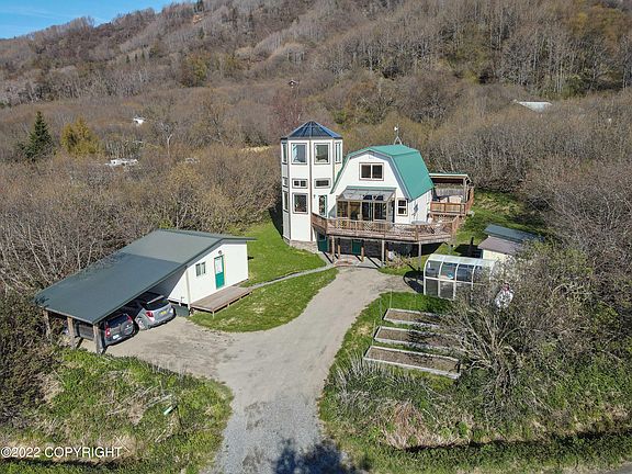 This private Homer retreat has stunning panoramic views, a coveted East End Bench location, and abundant wildlife! Just 6 miles from town, you will marvel at the frequent sightings of cranes, eagles & moose and spectacular sunrises & sunsets. View from the turret spans from the head of Kachemak Bay to Cook Inlet. Hardwood & tile flooring, unique turret spaces, and a bunkhouse for summer guests.The East End bench is known as the garden bench and this property includes a greenhouse, 3 raised beds, a small shed for gardening tools, and a shallow well for watering. The unique 3-story octagonal turret with a glass roof and beautiful spiral staircase was built by Beachy Construction and is a place you just won't want to leave. Relax, read your book, and spend time with your loved one(s) in this welcoming, light-filled, comforting space. The top floor affords spectacular views of all of Kachemak Bay and out to the Inlet and allows you to be at the same level with the cranes and eagles as they fly right by! The upstairs floor of the home includes a front and back bedroom. The bathroom, kitchen, family room (known as the "pub"), laundry area, and living room are on the main level. A lovely solarium extends out from the living room and is a perfect spot for your morning coffee or tea. Other features of the property include: Excellent solar gain. Separate bunk house or studio/office space. 2-car carport. Spacious front and side decks. Private hot tub on east-side deck. Wood stove and slate flooring in family room. Beautiful knotty alder bar cabinet in family room. Propane Rinnai heater in living room. Propane Rinnai heater with battery back-up in basement. On-demand Rinnai water heater in basement. 1,100 gallon water holding tank in basement. Woodshed and garden tools shed.