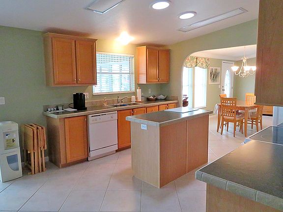 SALE PENDING! This FABULOUS turn-key home offers THREE Bedrooms, TWO Bathrooms, TILE THROUGHOUT with a lovely front florida room with slider windows. Primary Suite has a huge closet, linen closet in the bathroom, double sinks and step-in shower. Other two bedrooms are split from the primary offering maximum privacy. Huge kitchen has lots of cupboard space plus a big pantry. Large laundry area doubles as an office keeping all the messy things in one place! Great curb appeal. ROOF in 2022, 2015 HVAC. INCLUDES THE GOLF CART!