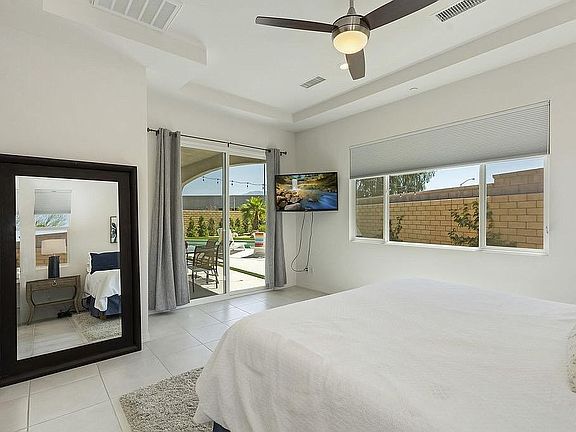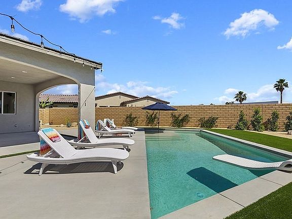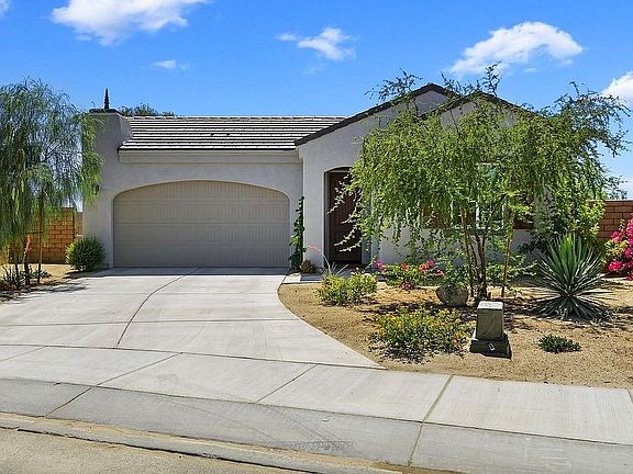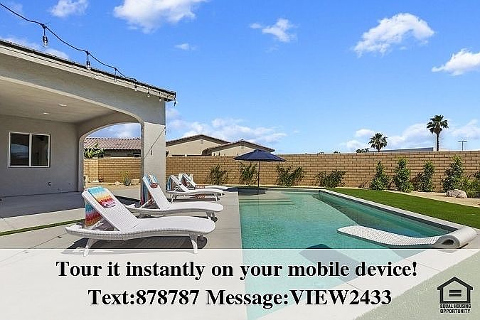 Are you looking for a Palm Springs style contemporary home in a 55+ community? Here it is, and only two years old. The pictures will tell you everything you want or need to know about this three-bedroom, which two of them are master suites, three bath home with a beautiful sparkling pebble tec pool designed by Teserra located in the Domani Development off Avenue 40. Think about sitting on the Baja pool deck sipping your favorite beverage and enjoying its serenity. Delight in the luxury of an open floor plan for your entertaining pleasure. The kitchen is appointed with quartz counters, a large island, stainless steel appliances, soft close cabinets, under cabinet lighting and clear story windows. There is ceramic tile flooring in the main areas of the house and carpet in the bedrooms. Check out these incredible ceiling fans. You and all of your friends can enjoy the mountain views from the large back yard that has ample room for doing all kinds of fun things like bocce ball, horse shoes, volleyball or just simply sitting around the fire pit. You will not find a more elegant property in this price range. There is overhead storage in the two-car attached garage. See 'more'