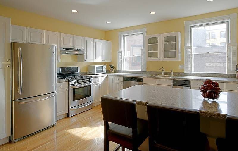 Walk to "T", shops and restaurants. Located on a quiet Gas-Lit Street, this renovated home boasts sought-after, open layout with hardwoods throughout. Sunny kitchen includes gleaming stainless appliances, gas range, island that sits three. Large dining area. Spacious living area features custom built-ins surrounding the gas fireplace. Newly renovated Carrera marble bathroom has Expresso vanity and cabinet, soaking tub and separate shower. Washer/dryer, cent. air.