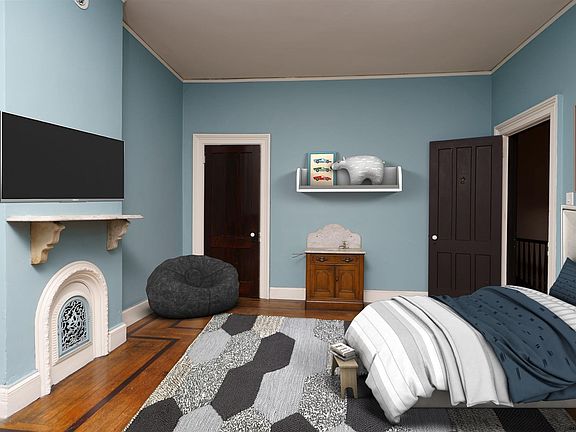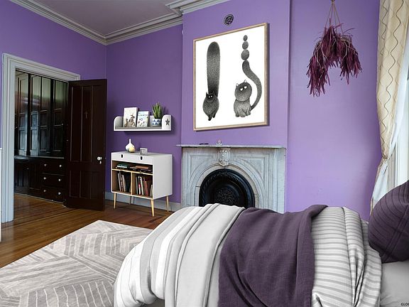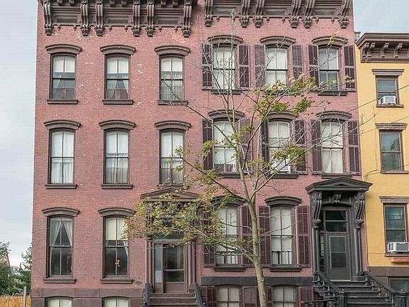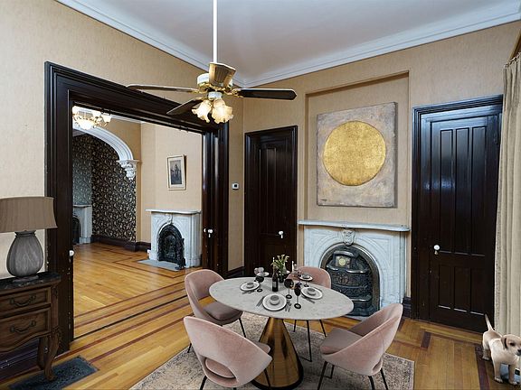 Built by one of Albany's most prolific 19th century builders, James Eaton, this exquisite three-story statuesque brick row house is situated along on one of the city's most aesthetically pleasing townscapes - Ten Broeck Triangle. Conveniently walkable to downtown, The Palace, State & Legislative buildings, popular eateries, coffee shops, bars & MORE. Mesmerizing views of the city skyline can be seen from the 2nd/3rd FL. Desirable features include lofty ceilings, oversized windows, wood burning marble encased fireplaces w/original inserts , custom wood floors, grandeur moldings, skylight & built-ins. Original detailing is still adorned throughout. 2nd FL W/D. Outdoor composite deck. Carriage house/garage with rare off-street parking is included with the sale. Private park across the St.