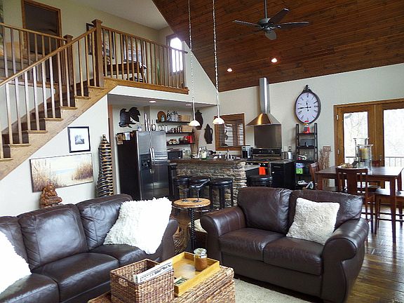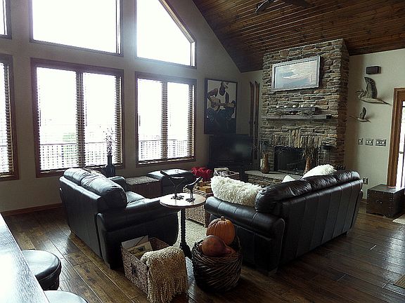 Beautiful 3 bedroom, 2 bath home built in 2009 with fantastic lake views! Open concept main level combines kitchen, dining area and living room complete with wood floors, stainless appliances and stone wood burning fireplace. Lake views and deck access from this area as well as a 3 season room off the deck, main level laundry room, a full bathroom and two guest bedrooms. The loft area has a office space/sitting area as well as a full Master Suite with private full bath and walk-in closet. The walk-out lower level has a family area and large storage/utility room. This property has a detached two stall garage built in 2011, a circular drive and backs up to a reserve area at the lake with a slip available for your boat all season.