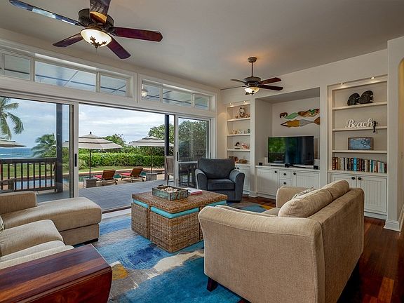 Enjoy a rare and expansive coastline view from a solid, well-built home on 1.87-acres in sunny Aliomanu, the gateway to the North Shore of Kauai. Enter through a private, gated palm-lined driveway to the well-cared-for home where the Pacific Ocean greets one as they enter the front foyer. The home's 3,331 square feet of living area is expanded by nearly 1,000 square feet of lanai space and an additional pool deck. The home's North-facing position maximizes the spectacular view plane and captures the cooling trade winds. The home features four-bedrooms, three-full baths and two-half baths. All of the bedrooms and living areas capture the ocean views and open onto lanai space. Enjoy the outdoors in the heated, saltwater pool and outdoor kitchen area. To satisfy any foodie, there is a chef's kitchen, a walk-in food pantry, a butler's pantry, indoor and outdoor wet bars, and a poolside wood-burning brick pizza oven. Architecturally designed for efficiency and longevity, the home is solidly constructed of insulated concrete forms, which are termite and hurricane resistant. The home is perfect as a full-time home or second home; no vacation renting.The level property features fully landscaped grounds and an assorted "citrus row" growing along the bocce court with orange, nectarine, lemon, Thai lime, and Kieffer lime. The property also has coconut and avocado trees. The property is primed for a farm-to-table garden. Aliomanu is only a 10-minute drive from Kapaa Town and serves as the gateway to the North Shore. The location allows for sunnier, drier weather compared to other locations.