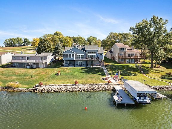 Discover your lakeside paradise in this exquisite waterfront home on Lake Carroll. Built in 2016, this stunning property sits on a meticulously landscaped .36-acre lot, boasting over 93 feet of shoreline. As you approach, you'll be captivated by the home's elegant exterior, featuring low-maintenance LP Diamond Kote Smart Siding, and the breathtaking views that surround it. Step inside through the maintenance-free front door to find a harmonious blend of luxury and comfort. The main level welcomes you with a spacious Living Room, where large windows frame picturesque lake views and offer seamless access to the outdoor deck (where you can take in amazing views of the 4th of July fireworks). A gas fireplace with remote control adds warmth and ambiance. The open-concept layout flows effortlessly into a gourmet kitchen and dining area, a true chef's dream featuring sleek granite topped island and Carrara marble countertops. A generously sized, dedicated pantry and convenient main-level laundry/mud room add to the home's functionality. The crown jewel of the main floor is the stunning primary suite. This private retreat boasts a spa-like ensuite bathroom with double vanities and a luxurious soaker tub, a large walk-in closet for ample storage, and a 3-season room perfect for enjoying morning coffee or evening relaxation. For added luxury, the primary suite provides direct access to the deck, allowing you to start each day with inspiring lake views. A well-appointed guest bedroom and full bath complete the main level, ensuring comfort for family and visitors alike. Descend to the walk-out lower level, where entertainment and relaxation await. A sizeable family room with two areas to entertain and a wet bar set the stage for memorable gatherings, while an additional full bath and guest bedroom provide extra accommodations. Ample storage in the utility room and an awesome workshop (with access to the garage) offer space for all your needs and hobbies. The upper level of this versatile home serves as a flexible space, adapting to your lifestyle. Whether you envision a home office, an energizing workout area, a creative hobby space, or a charming bunk room for extra guests, this area is ready to bring your ideas to life. It features its own separate heating and cooling system for personalized comfort. Practical features abound, including a spacious 3-stall attached garage that's heated and large enough to accommodate a full-size boat, waverunner, golf cart and two full-sized cars. The home features a dual-zoned heating and cooling system, a central vacuum system for easy cleaning, and 40-year shingles for long-lasting protection. Water quality is assured with both a reverse osmosis system and an iron water treatment system. Outdoor living is a dream with maintenance-free decking and a relaxing hot tub. The property's main dock system, new in 2022, features an extended width wing and a convenient ladder system, perfect for enjoying all that Lake Carroll has to offer. The driveway, newly sealed in September 2024, adds to the home's curb appeal and low maintenance benefits. This gorgeous property is more than just a home; it's an invitation to a lifestyle of lakeside luxury, outdoor recreation, and year-round beauty. Its prime location near the golf course offers endless opportunities for adventure. Some furniture is included, allowing you to move in and immediately begin your Lake Carroll adventure. Don't miss this opportunity to make your waterfront dreams a reality on the shores of Lake Carroll, where every detail has been thoughtfully considered to create the ultimate lake home experience.