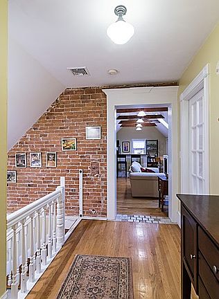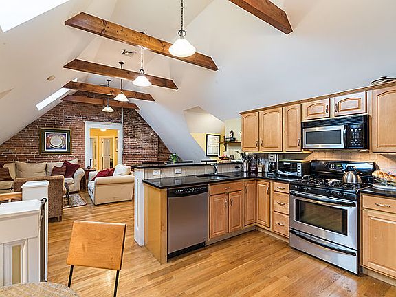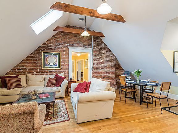 Refreshingly different from anything in Roslindale. Wonderful renovation of a former church building, this 2 bedroom has loads of character with beamed cathedral ceilings, skylights, open layout and exposed brick. Contemporary floor plan great for entertaining also allows for flexible use. Honed granite counters accent the large eat-in kitchen, which also boasts a breakfast bar, pantry and beautiful pendant lights. Generous-sized bedrooms. Spa-like master bath has beautiful tumbled marble, jacuzzi tub and separate shower. Contemporary 1/2 bath with laundry. Keep cool with central AC or relax outside in the beautifully landscaped shared yard and patio. Lots of storage, plus 2 car parking. Strong 100% owner occupied association. 2011 roof. Walk to the Village shops, restaurants & train.