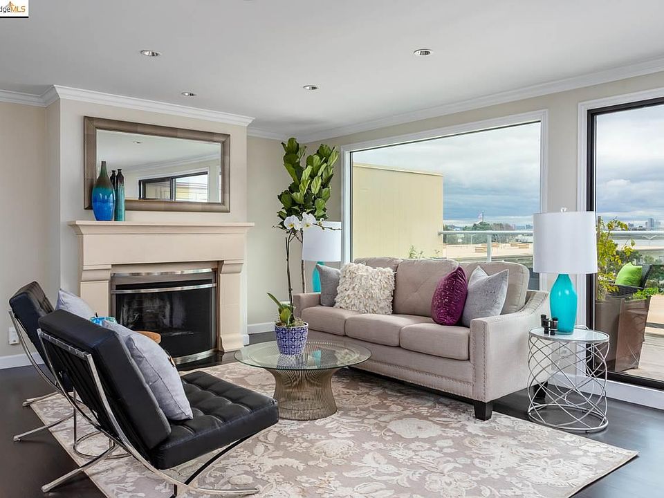 OVER THE TOP PENTHOUSE in Emeryville's Premiere Resort Condo Complex. SPECTACULAR PANORAMIC VIEW of the Bay & Oakland skyline from the giant double pane picture windows or on the huge outdoor deck. Skylights & wood burning fireplace. TOTALLY REMODELED w/luxurious dark hardwood floors, smooth ceilings & dimmer controlled recessed lighting in every room. Lavish spa-like master bath/dressing room w/skylights, marble walk-in shower, marble floors, floating vanity cabinet w/double sinks embedded in the gleaming marble counter. Lovely granite counters & custom cabinetry in the kitchen w/cabinet-faced GE Profile double door fridge w/ice & water in the door. Dacor oven & Bosch dishwasher. Private, end unit location. Resort facilities include heated pools, extensive gym w/ steam rooms & saunas, lighted tennis courts, racquetball & more. EV charging onsite. Walk to shopping & great restaurants. 15 min. to SF by car. Free BART shuttle. Casual carpool to SF. Perfect home or Bay Area hideaway.