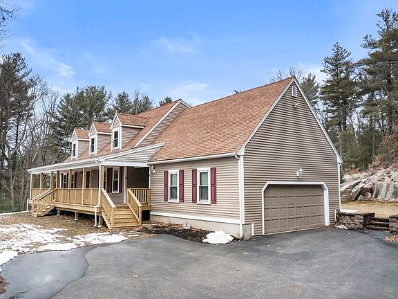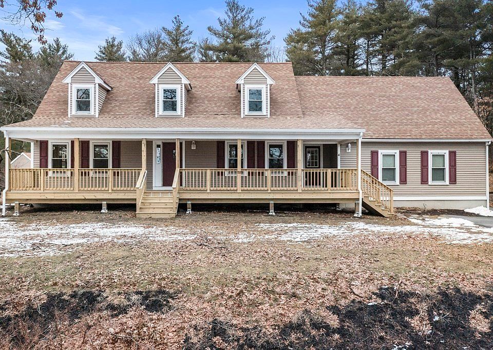Set back from the road at the end of a cul-de-sac, this stunning & expansive 4 BA 2.5 BA Cape with over 2400sqft of living space is privately nestled on close to 1 acre. The dream farmer's porch is perfect for outdoor seating & decorating. The spacious living room has lots of windows and natural light. The dining room with wainscoting is ready for your formal dinners. The large kitchen features stainless steel appliances, an abundance of cabinetry and dining area. The kitchen and family room with fireplace are well suited for entertaining as both have sliding door exterior access to the nice deck and back yard. Hardwood floors and tile flow throughout the first floor. Upstairs features 4 carpeted bedrooms with closets and overhead lighting. The master features a lovely en suite that boasts a tiled shower with marble bench. New septic prior to closing. Close to Rte 1, 495, 95 and Patriot Place. Fall in love with this home and make it yours today! This is a rare opportunity!