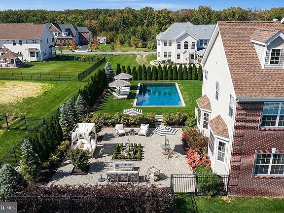 Welcome to this stately home in desirable Cubberly Meadows. This brick beauty features 5 bedrooms & 5 1/2 bathrooms. Prepare to be awed by the gorgeous custom moldings and Brazilian walnut flooring featured throughout the first floor. Formal living room opens to the dining room with two bay windows and spectacular ceiling moldings. Gourmet kitchen with 8ft island, granite countertops, tile backsplash, top of the line Thermador commercial grade appliances and walk-in pantry. Family room with cathedral ceilings and wood burning fireplace for those cool winter nights ahead. Large first floor bedroom/home office with closet and full bathroom. Completing the first floor is an additional half bathroom, laundry room with closet, sink and exterior access and a generous three-car garage. You'll find floor to ceiling recessed wainscoting from the foyer leading you upstairs and throughout the upper hallway. Each bedroom has its own ensuite full bathroom and walk-in closet & each features moldings and has a unique bonus feature. One bedroom boasts a vaulted ceiling. Another bedroom has two closets and the other bedroom has a unique storage room that you can enter through a "hidden" door in the molding. The primary bedroom includes a sitting area, gas fireplace and an enormous double walk-in closet with vanity. The primary bathroom is simply stunning with Carrera marble tile throughout the bathtub, flooring, shower and separate vanities. Step out into the backyard oasis of tranquility with courtyards and paver patio all surrounding a gunite saltwater pool that feels like you're in a home in the Hamptons! This home is situated across from 6 acres of open space on a prime lot in the neighborhood and also features dual zone HVAC, completely fenced in yard with black aluminum fencing, natural gas line for outdoor grilling and backyard sprinkler system. Don't miss this incredible opportunity!