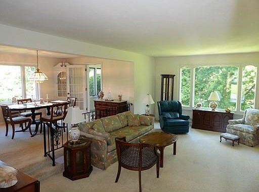 Enter into this gracious home with sunken living room, fireplace, picture window, crown molding and ww over hardwood floor. Step up to open dining room with picture window, built in corner cabinet, ww over hardwood floor and french door to heated sunroom. Large kitchen with parquet floor, built in cabinets, spacious dining area picture window and two utility closets. Master bedroom with full bath and hardwood floor. Two additional bedrooms with hardwood floors. Combination lav. and laundry on first floor. Great rec room in walk-out basement has fireplace, bar area, tongue and groove paneling and wall of cabinets. Office with ww. Newer roof, furnace, oil tank Andersen and Marvin replacement windows. All kitchen appliances and washer and dryer remain. Large storage area under sunroom. Two car garage with pull down ladder to storage. Two sewer hook ups.