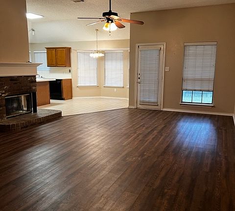 Great home and neighborhood! This three bedroom home offers open floor plan with large living room with laminate flooring and wood burning fireplace. Primary bedroom offers ensuite bath with separate dressing area, double sinks, garden tub and separate shower and large walk in closet. Split bedrooms with bath and great closet space. Large Kitchen has island, electric stove, built in microwave and dishwasher. Large fenced backyard with trees and large storage building. Tenant is responsible for all utilities and yard maintenance. Contact agent to find out how to qualify for this home.