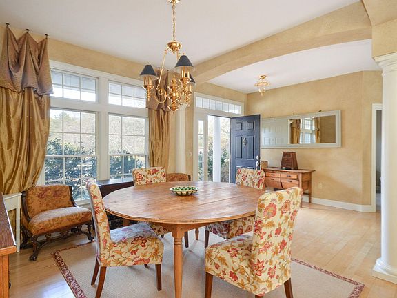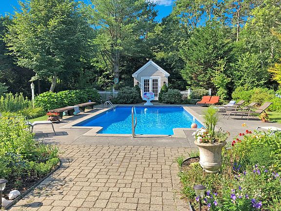 4 Aviators Lane is a stunning contemporary ranch on a private side street in historic Sandwich. Elegant inside and out, this large 2600+sq. ft. home features a magazine worthy outdoor entertaining area including in-ground pool, dramatic stone fireplace, huge patio and porch. Inside, the cathedral ceilings, tall oversize windows, and open floor plan create sunlit, airy spaces. There are hardwood floors, natural gas heat, central air and solar panels. The spacious eat in kitchen with breakfast nook and breakfast bar has ample room for friends and family to gather. The primary bedroom suite has a luxurious en suite bathroom with soaking tub and shower. There is a fireplaced family room, dining room, study, living room and two guest bedrooms. The fully finished basement adds an enormous amount of usable living space and the attached oversized two car garage provides plenty of storage room. Enjoy access to the pond as part of the association and take advantage of all of Sandwich's excellent year-round shops, restaurants, museums and beaches just moments away.