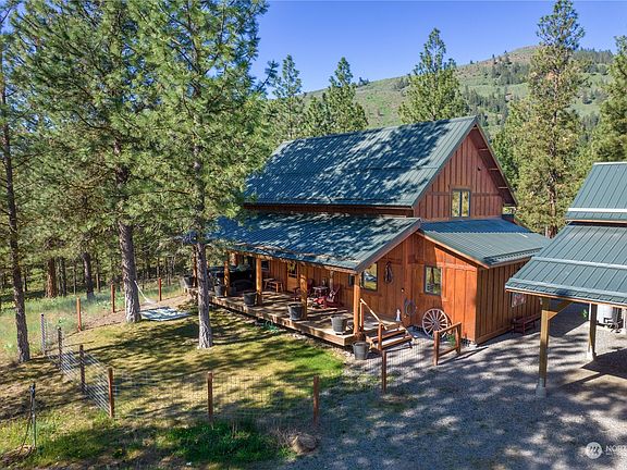 Discover this iconic, well-constructed cabin nestled on 1.9 acres in a sunny clearing, surrounded by scattered pines & wildflowers. Cozy yet spacious open floor plan features a handsome river rock hearth, log staircase, & vaulted ceiling. Primary bdrm on main floor boasts a hi-end ba & deluxe walk-in closet. 2nd comfortable bedroom w ensuite ba, plus a spacious bonus room/loft on 2nd floor. Relish morning coffee, happy hour or hot tub on two covered cedar decks. Perfect in all seasons & weather. Interior has been updated w new lighting, blinds, heat pump, appliances, & additional storage space. EZ to maintain yard includes a sm fenced lawn w lilacs. Fenced horse corral area & tall 3 bay carport. Just minutes away from Winthrop's amenities.