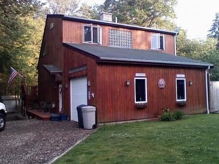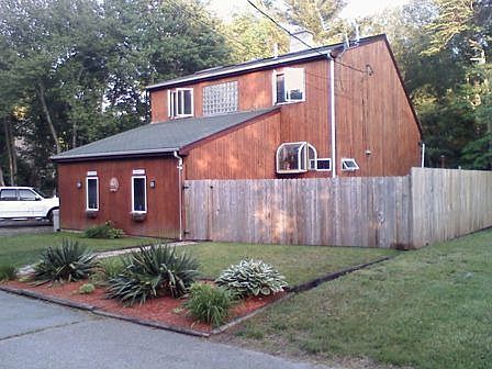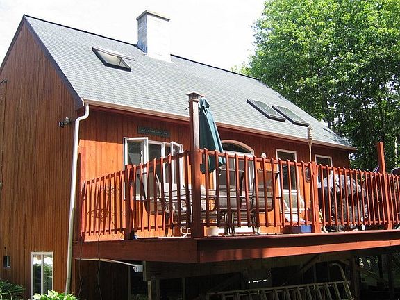 Welcome Home....to this 3 bedroom, 2 bath contemporary with beautiful open floor plan consisting of a living room, dining area and kitchen. This space has soaring cathedral ceilings and opens to a massive deck for entertaining. Spiral staircase to interior balcony on second floor overlooks it all. Added features include raised hearth with gas fireplace between living room and dining room and jacuzzi tub with glass block wall in shared upstairs bathroom. The two bedrooms on upper level have vaulted, beamed ceilings with the master featuring a walk in closet with its own skylight. Family room in finished basement has convenient walk out to fenced in backyard. Home has been newly painted inside and out and has freshly refinished floors. Pride of ownership shows! Enjoy the convenience of this home's location...close to shopping, dining and highway with the privacy of a dead-end street. Best of both worlds. Don't miss this one.