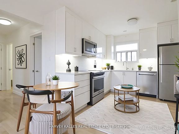 Bright and spacious 2-bedroom apartment in the heart of Port Credit, just steps from the lake, shops, and GO Station. Fully renovated about five years ago with new flooring, modern finishes, and a newer A/C unit. The kitchen features stainless-steel appliances - stove, fridge, dishwasher - plus an in-suite washer and dryer for added convenience. Enjoy open-concept living ,abundant natural light, and the relaxed coastal feel of Port Credit's most desirable neighbourhood. A perfect home for professionals or couples seeking style, comfort, and walkable convenience. Parking $100/month extra. One small, harmless pet allowed. NOTE: Photos have been virtually staged.