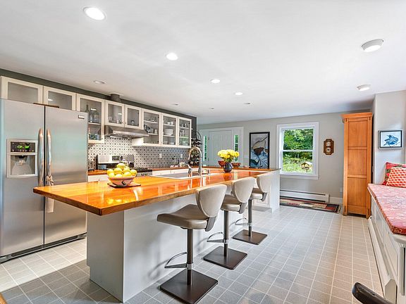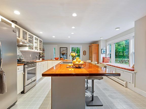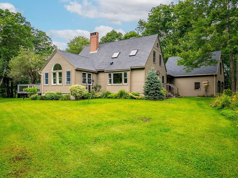 Tucked away in a quiet, peaceful neighborhood just minutes from the center of Freeport, you will find this delightful cottage-style home. The graceful curves of the driveway lead you toward this house, which is perfectly situated to take full advantage of its natural setting. Mature trees, ''wilding'' gardens designed to attract and shelter bees and pollinators, and an undulating yard that creates vistas from every window add to the experience. The interior mirrors the exterior in that broad windows with southern exposure brighten the oversized kitchen with its thoughtful and extensive storage. A brick hearth with both a fireplace and a wood stove anchors the open floor plan and provides both a warm ambiance and an efficient alternate heat source. The great room ceiling soars, and large windows take in the views of the seasons and the light year-round. Just off the great room is an expansive deck perfect for entertaining, dining, and birdwatching. Also on the first level is a primary suite with a thoughtfully designed zero-threshold shower. Behind the kitchen is another bedroom, currently utilized as a den and home office space with an ensuite bath and laundry area. Upstairs, you will find another expansive bedroom and sitting area that can also serve multiple uses, and a private, oversized bathroom with skylights. This space is perfect for visiting guests and could accommodate more than one bed or be used as a media room, gym, or even a studio. Newer and highly efficient boiler as well as a whole house generator. Storage is plentiful with a large unfinished basement and another generous space over the garage.