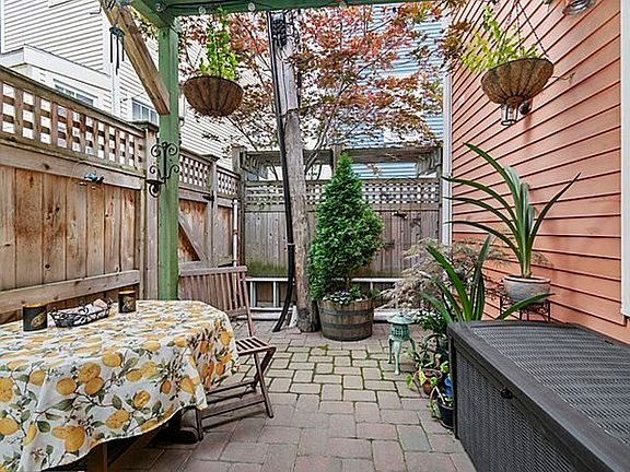GREAT CONDO ALTERNATIVE!! This pumpkin colored 1850 historic worker's cottage, on a gas lit private way, is full of character and has an open floor plan. The living room is warmed by a gas fireplace and features a lovely stained glass window. Its oak floors spill into the wood cabinet kitchen and dining space with it's lovely arched window! A split door leads to a private fenced in brick paver patio! Two nice sized bedrooms on the 2nd floor with wide pine floors- one with sliders to a deck. The other has a unique wood ceiling. They share a full tiled bath with pedestal sink. The lower level has been finished with wood grain floor tile, white washed brick and features original beams. There is a full tiled shower bath, W/D and storage space. Rental parking for $150/month is available just around the corner on Franklin Street. (see attached document)