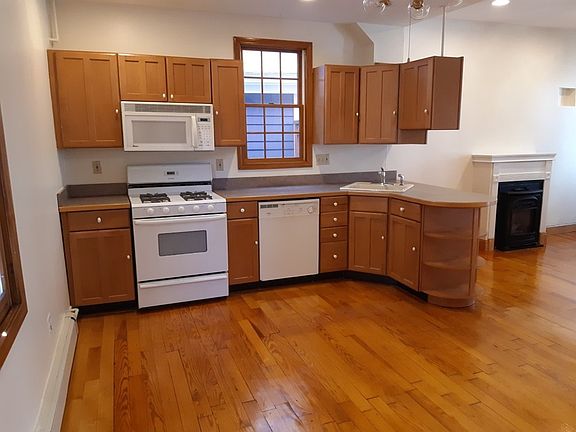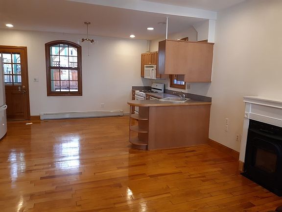 This pumpkin colored 1850 historic worker's cottage, on a gas lit private way, is full of character and has an open floor plan. The living room is warmed by a gas fireplace and features a lovely stained glass window. Its oak floors spill into the wood cabinet kitchen and dining space with it's lovely arched window! A split door leads to a private fenced in brick paver patio! Two nice sized bedrooms on the 2nd floor with wide pine floors- one with sliders to a deck. The other has a unique wood ceiling. They share a full tiled bath with pedestal sink. The lower level has been finished with wood grain floor tile, white washed brick and features original beams. There is a full tiled shower bath, W/D and storage space. Rental parking for $150/month is available just around the corner on Franklin Street. (see attached document)