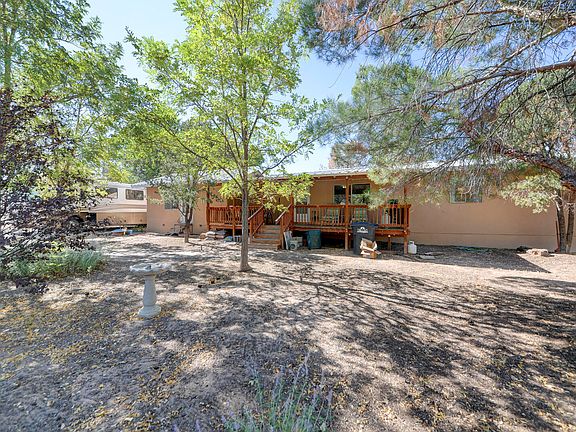 Prime 1.45-acre property with endless possibilities! Featuring a versatile 2,560 sq. ft. workshop with three overhead doors, fully heated and cooled--ideal for commercial use. The 1,639 sq. ft. modular home includes 3 bedrooms, 2 bathrooms, a laundry room, an office with a separate entrance, an open floor plan, and a covered deck. Built on a permanent foundation, it's perfect as an office or live-work space. RV hookups present and approx. half an acre is fenced as a corral, with the entire property gated for security. Excellent highway access to Santa Fe and Albuquerque, offering tremendous potential for businesses needing secure equipment and trailer space.
