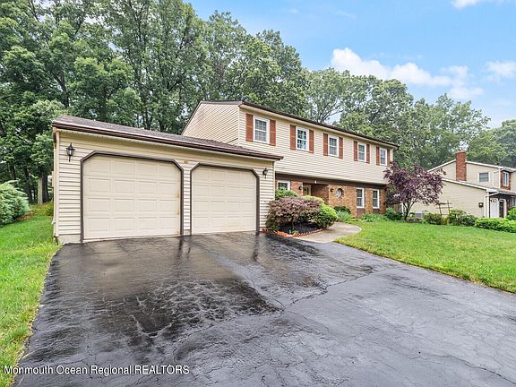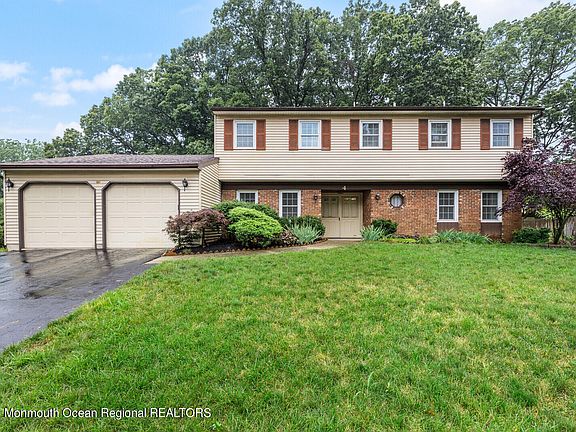 Entrance of Cul-De-Sac, Brick front sun filled the Sandburg colonial home in a desirable area of Marlboro, 4 BR, 2.5 Bath, 2 car oversized garage, park like backyard, newer full roof (2018), newer windows that provide plenty of natural lights, double front doors into open foyer leading to formal dining rm w/chandelier, airy living rm & eat-in kitchen w/ breakfast bar & windows & sliders to patio w/retractable awning, spacious family rm can be used as an office w/ windows is perfect for relaxing or working fm home, master bedroom w/ large walk-in closet & another closet & 3 more BR w/full bath, laundry rm w/cabinet & plenty of storage spaces & door to backyard, sized two garage w/high ceiling & extra storage space for miscellaneous, pull down stairs to attic w/attic fan, 6 zoned sprinkler Take advantage of this peaceful and wonderful neighborhood & nearby Marlboro Town Top Schools, shopping, nature parks w/ trails, Train station & Bus to NYC, near highway 18, 9, 33, 35, NJTNPK & GSPKY.