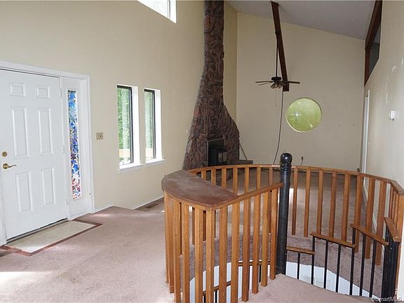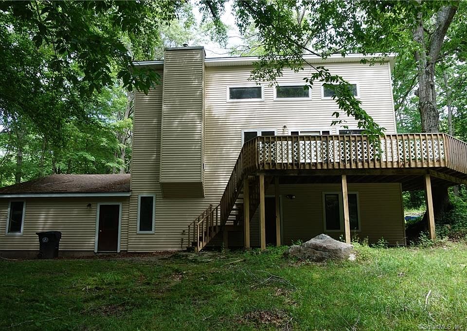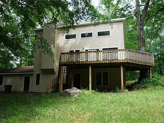 Immediate occupancy on this uniquely styled contemporary home! Private 4+ acre wooded setting surrounds this 'tree house'! Tired of cookie cut? this home is for you. Main floor features a great room with versatile and open floor plan. MB on this level with FB. LL, via spiral staircase offers two additional bedrooms and full bath. There is a large unfinished room that provides great option for a FR (not in sq. ft.), workshop or rec area! Garage is an over-sized tow car! Floor to ceiling stone fireplace with wood stove insert. This is a fun home with many architectural highlights not often seen in new England homes. Quiet and convenient subdivision. the exterior of this home smiles back at you with brand new siding and trim. Rest of the updates are yours to plan and enjoy! Priced accordingly.