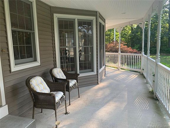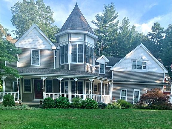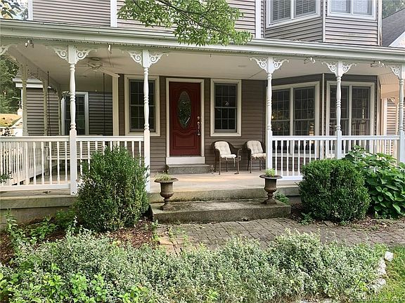 Beautiful Property, 3400+ sq. ft. including finished basement. Victorian style home with open concept kitchen/living room which is located in a well-established Ellington neighborhood, set back on a quiet, elevated, 1-acre, Cul-de-sac. Features a beautiful wrap around front porch. A large tiled foyer opens up into the main living space with crown molding & custom trim work including built in entertainment center. Hardwood floors through out the first floor, which includes a renovated custom kitchen, painted raised panel cabinetry, granite countertops, tiled backsplash, breakfast bar, & dining area open up into a large family room & living room. Both rooms have southerly exposure with French sliders that open up to a composite Azek deck with vinyl railings - great for entertaining. The living room has a remarkable cherry mantle, propane fireplace, wet bar with marble countertop, cherry cabinets & beverage fridge. A window-filled dining room, & half bath complete the first floor. The 2nd floor offers a massive, Master bedroom suite including Palladian windows, window seats, & over-sized walk-in closet. The tiled Master bath has a dual-sink vanity & walk in tiled 'steam' shower. The basement contains a 24'X17' Rec room with cedar walk-in & wine closet. There is also a 3-car, attached heated garage, & a 2-bay carriage house with an large upper area. Owner is also listing agent.