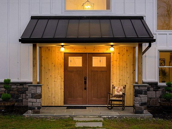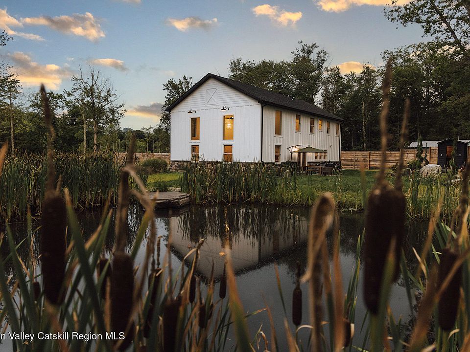 For those seeking a turnkey retreat with contemporary farmhouse charm, this newly built home on 1.3 acres is a true standout. Thoughtfully designed for both beauty and low maintenance, it features white Hardie board and batten siding, bluestone patios, cedar accents, and efficient Pella windows. A picturesque pond with tall cattails and a floating stone platform adds to the serene setting, while high wooden fencing ensures privacy.