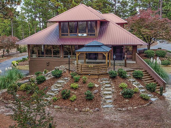 The main attraction is the soaring 30 ft tall Atrium in the center of the home equipped with large skylights and a spiral staircase to the second level. Custom doors from the Smith's restaurant surround the atrium and two of those doors lead to one of TWO Owner's Quarters with attached En-Suites (one on each level of the home). Not included in the 2,803 heated square footage, is a nearly 300 square foot Carolina room that opens up to a concrete back porch area with metal fencing overlooking the back deck, Gazebo, and stone waterfall.
