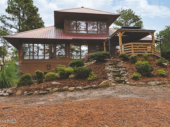 From the atrium, take the metal spiral staircase up to the expansive overlook and through the main bedroom quarters with attached En-suite, closet space, and custom built-in bed frame facing the beauty of the Pine laden land and the 10th hole of one of two 18 hole golf courses at Foxfire Resort. The views from every level of the home are breathtaking.