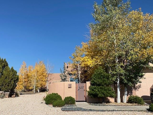 With expansive mountain views from almost every room, this sophisticated open concept home with attached studio is sited on a 1.14 acre Premium Estate Lot. The living area, graced with 12 ft. high ceilings, large kiva fireplace and intimate window seating, opens to the kitchen and dining areas for easy entertaining. French doors lead to a large outdoor covered living area complete with stone sculpture water feature, perfect for enjoying the abundance of birds and New Mexico's gorgeous open space. Two more portals with attractive landscaping wrap elegantly around to the north. The owner's suite, with enormous walk in closet and a two sided fireplace has nice separation from the other bedrooms. Follow your artistic endeavors in the light filled attached studio space. An oversized two car garage with plenty of room for storage has direct access to this residence. Roof is 3 years old. Additional upgrades include Brand New Boiler for in floor radiant heat and 2 recently installed mini splits to supplement central Evaporative Cooling. Rancho Viejo offers over 14 miles of lovely walking trails, community parks, and easy access to all of Santa Fe's attractions. HOA dues are $336 per quarter cover trash pick up, recycling, and trail/ common area maintenance.