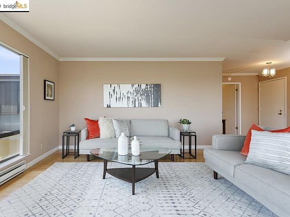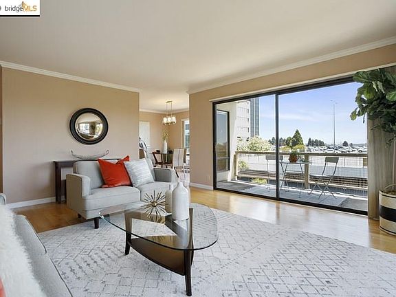 See a beautiful top floor, corner unit. Very large one-bedroom with great floor plan & great location in complex. Partial water view. Sunny and bright. Formal entry. Home office. Pantry. Walk-in closet. In-unit storage. Hardwood living room floor. Italian tile floor in kitchen and bath. New wool carpet in bedroom. Smooth ceilings. Crown molding. Kitchen and bath upgrades. Granite counters. Custom light fixtures. Hunter-Douglas VertiGlide blinds. All GE kitchen. Custom maple cabinets. Luxury shower enclosure & fixtures. Assigned garage parking. Easy parking for 2nd car and guests. Heated pool, spa, clubhouse, gym, tennis, racquetball, and many other amenities. 24 hour property patrol. Free Emery-Go-Round shuttle service to BART, Amtrak, shopping, restaurants. Easy access to I-80, I-580, Bay Bridge. Rare waterfront location. Steps to Boardwalk, Bay Trail & McLaughlin Eastshore State Seashore. Close to Trader Joe's, Trader Vic's, Chevy's and much more. Open Sunday 6/23, 2-4:30.