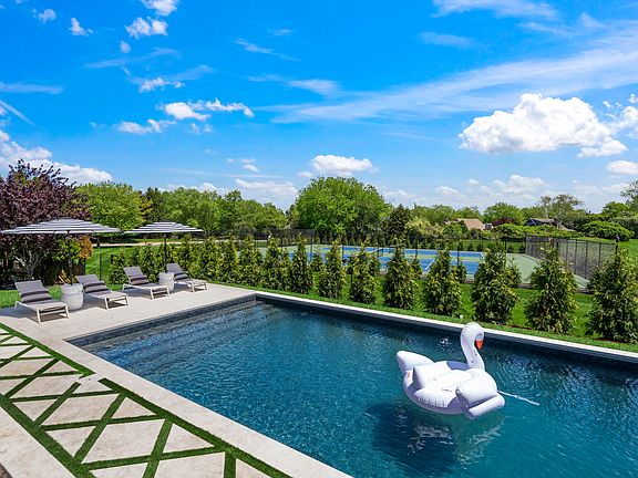 **Just 3 miles from Shinnecock Hills Golf Course. 1 Mile to Main Street. 2.5 Miles to Flying Point Beach.** Completely redesigned and newly rebuilt, this home sits on an expansive .3 acre with spectacular views located in a private cut de sac in the Dunes of Southampton. This coastal chic home features almost 3000 square feet of interior living space plus an outdoor lounge and dining area, fully fenced in, perfect for entertaining. First floor features king-size primary suite with sliders leading to outdoor living amenities and marble bath, a double height family room and dining room, with a new marble-surround gas fireplace, chef's kitchen with stainless steel appliances, 6 burner gas stove, waterfall island with white-oak fluted detail paneling and wall of sliding glass doors showcasing outdoor oasis. Upstairs features a balcony overlooking expansive first floor living space, second primary suite with luxurious ensuite bath and soaking tub, custom applied molding, and walk-in closet. There is an additional oversized bedroom with new full bath in hallway plus an office. The open staircase leads to a fully finished basement with recreation room and ping-pong table, new bathroom, bonus room with egress, and laundry room. Entire home is new from insulation to electrical and plumbing to new siding, roof, windows and outdoor living areas. Exterior amenities include a sand blasted marble patio with sleek cable railing, overlooking the gas heated salt-water pool and lounge area, pickle ball and tennis court and surround sound Sonos speakers. Custom pergola, gas grill. This newly reconstructed home was completed in May 2025. Close to Hampton Jitney and train stop as well as miles of pristine beaches and Southampton Village. Enjoy restaurants, shops and entertainment. Set on a quiet cut de sac enjoy all the Hamptons offers in a newly reconstructed home. Flexible dates available.
